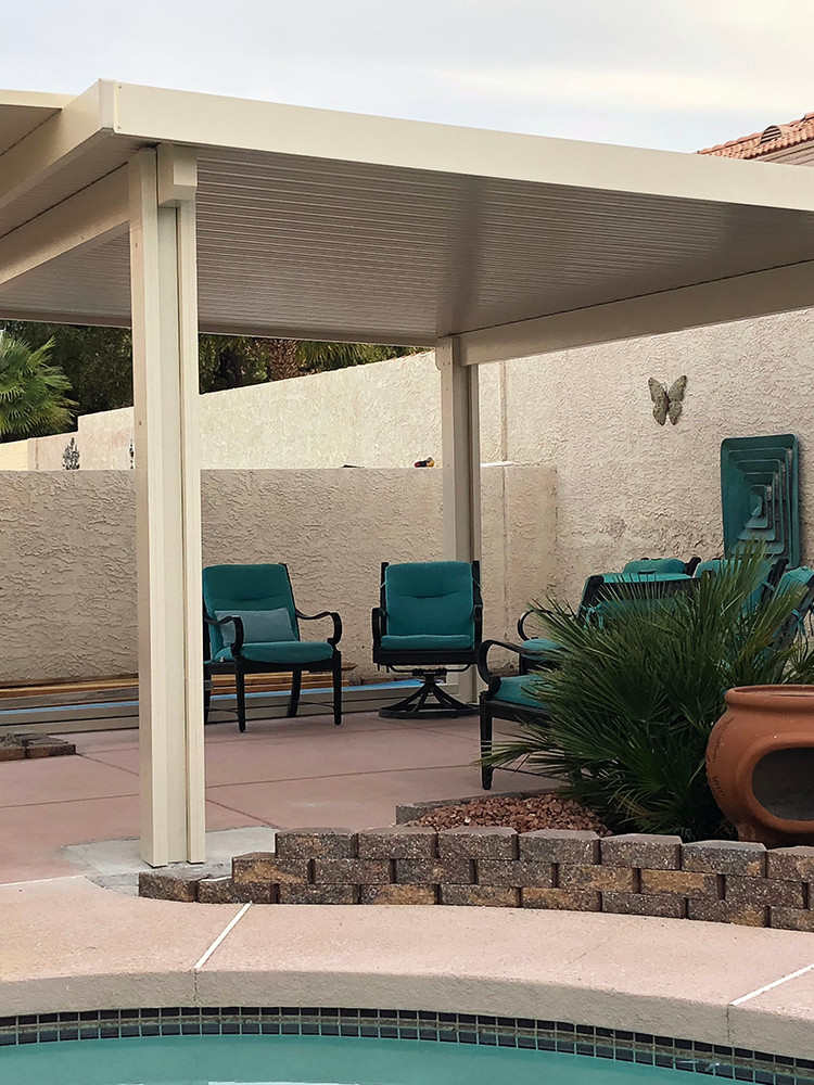 Pool Cabanas and Pool Deck Shade — The most common freestanding application in Las Vegas. A freestanding cover over a pool seating area, swim-up bar, or pool equipment zone provides shade without attaching to the house. Lattice freestanding covers are popular for pool areas where homeowners want filtered light and open sky. Solid and insulated freestanding covers are used where complete shade and rain protection are needed — such as over an outdoor kitchen or dining area adjacent to the pool.